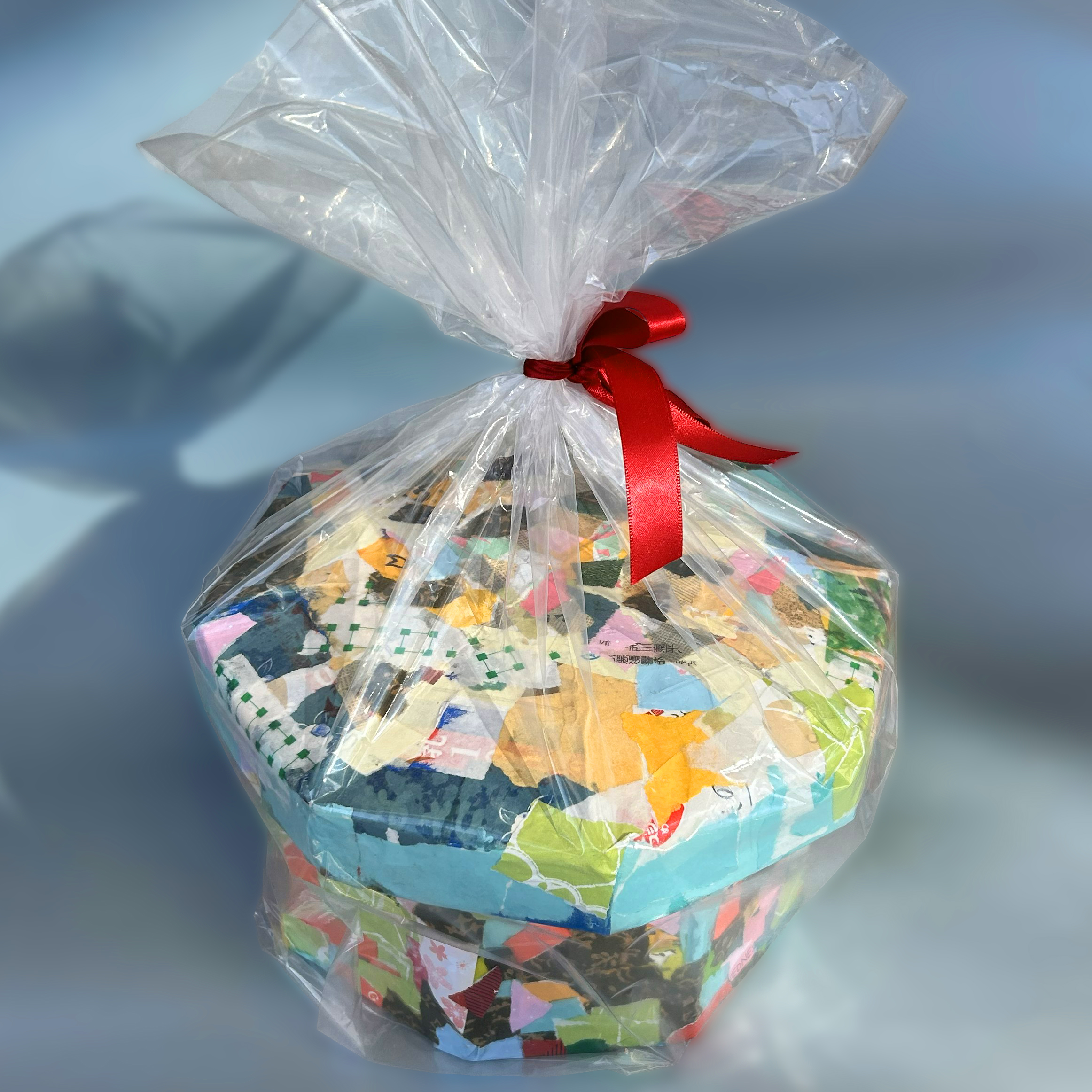 「フェリス」のみんなで千切り絵を貼った牛乳パックの化粧箱に、定番商品「がんね栗衛門」のほか、新商品「美和りぞちーの」シリーズなど、人気の菓子を詰め合わせました。